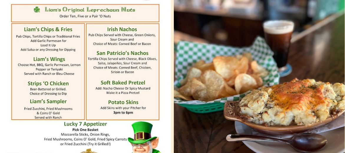 Yes, Liam's has weekly specials like Shepherd's Pie and Bangers and Mash. The pub also serves Liam's Original Leprechaun Nuts, perfect for a snack.