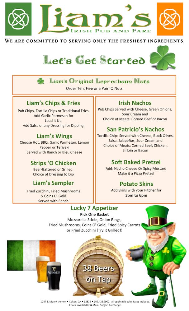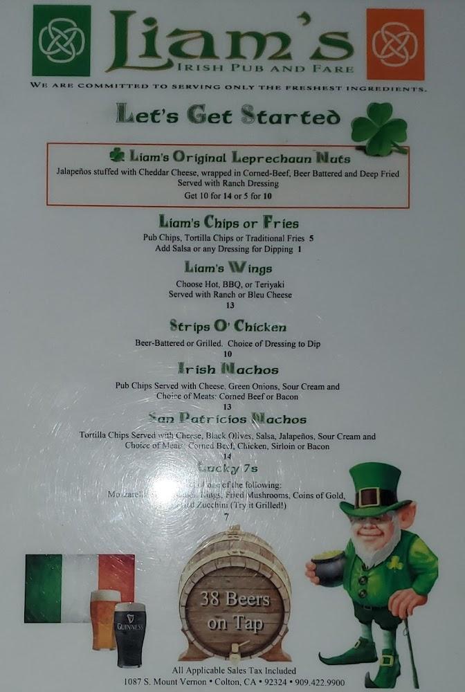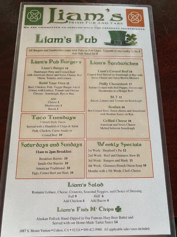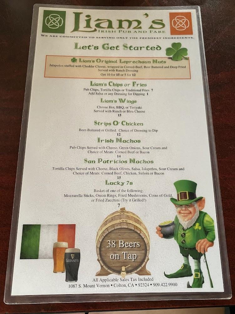 Welcome to Liam's Irish Pub & Fare, the heart of Colton where everyone knows your name! Enjoy a lively atmosphere with 38 beers on tap, delicious traditional Irish fare, and friendly service that keeps patrons coming back. Catch all NFL and Dodger games, or join in the fun with nightly karaoke at 8 PM and exciting game nights every Wednesday. Our pub features a pool table, outdoor seating, and quick service, making it perfect for solo diners or gatherings. Come experience exceptional cocktails, happy hour specials, and a welcoming vibe at Liam’s—your local pub destination!
